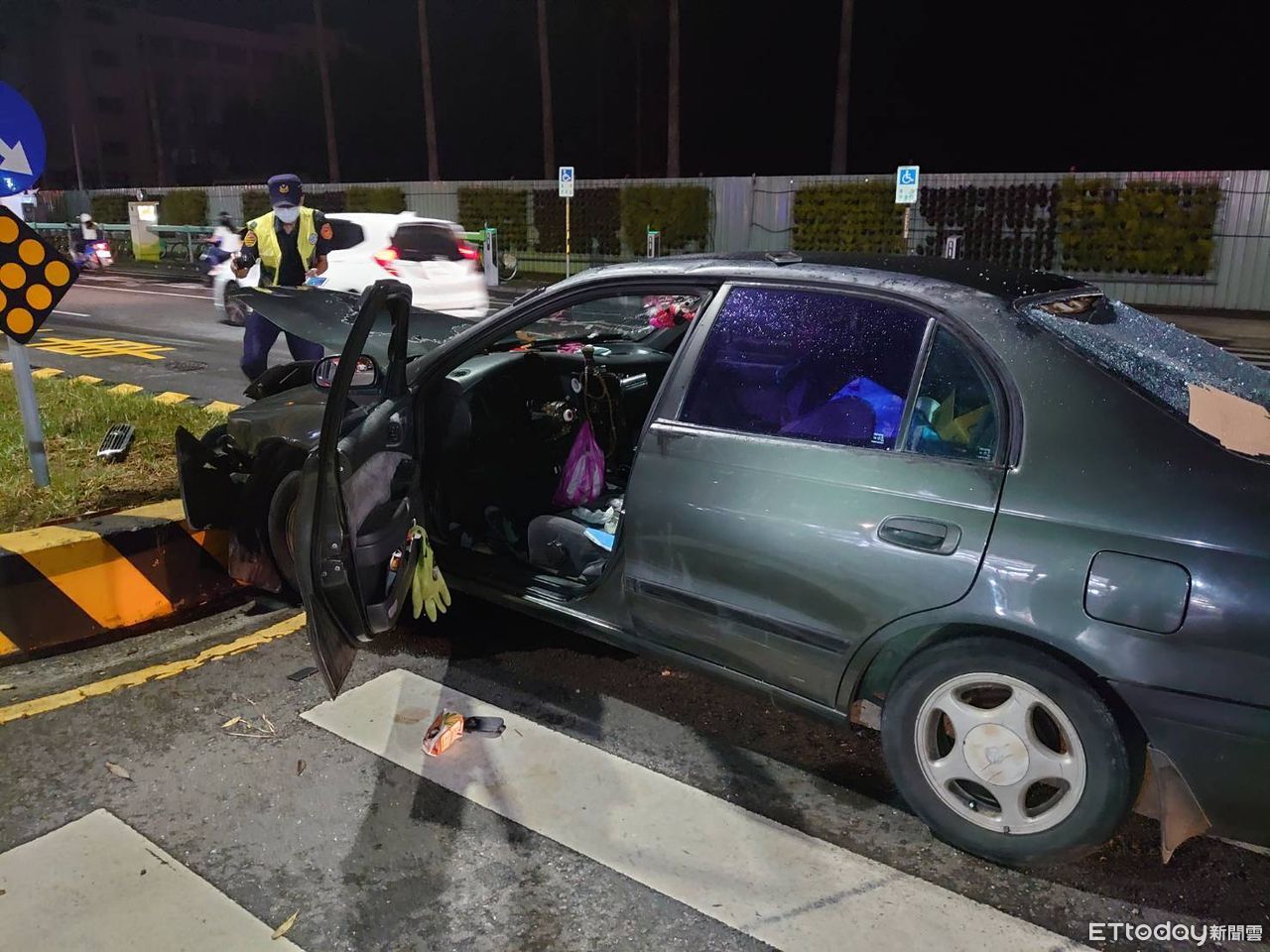 ▲台南市1名黃姓男子駕駛黑色轎車自撞安全島車毀人亡,黃男車輛車禍發生前疑被人砸車敲擊車窗玻璃,警方報請檢察官相驗,釐清案情中。(圖/記者林悅翻攝,下同)