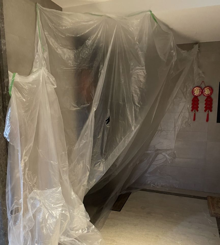 ▲父女3人在家居隔,大門竟被管委會貼塑膠布,家人氣炸提告。(圖/民眾提供)