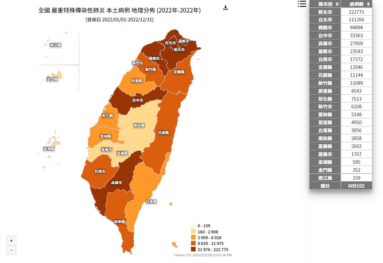根據疾管署更新的「本土病例地理分布」可見,今年1月1日統計至今,全台已有60萬9102人染疫,雙北的累計確診數均大於10萬例(見下列紅字),另有8縣市累計大於1萬例(此不包含雙北、見下列藍字)。