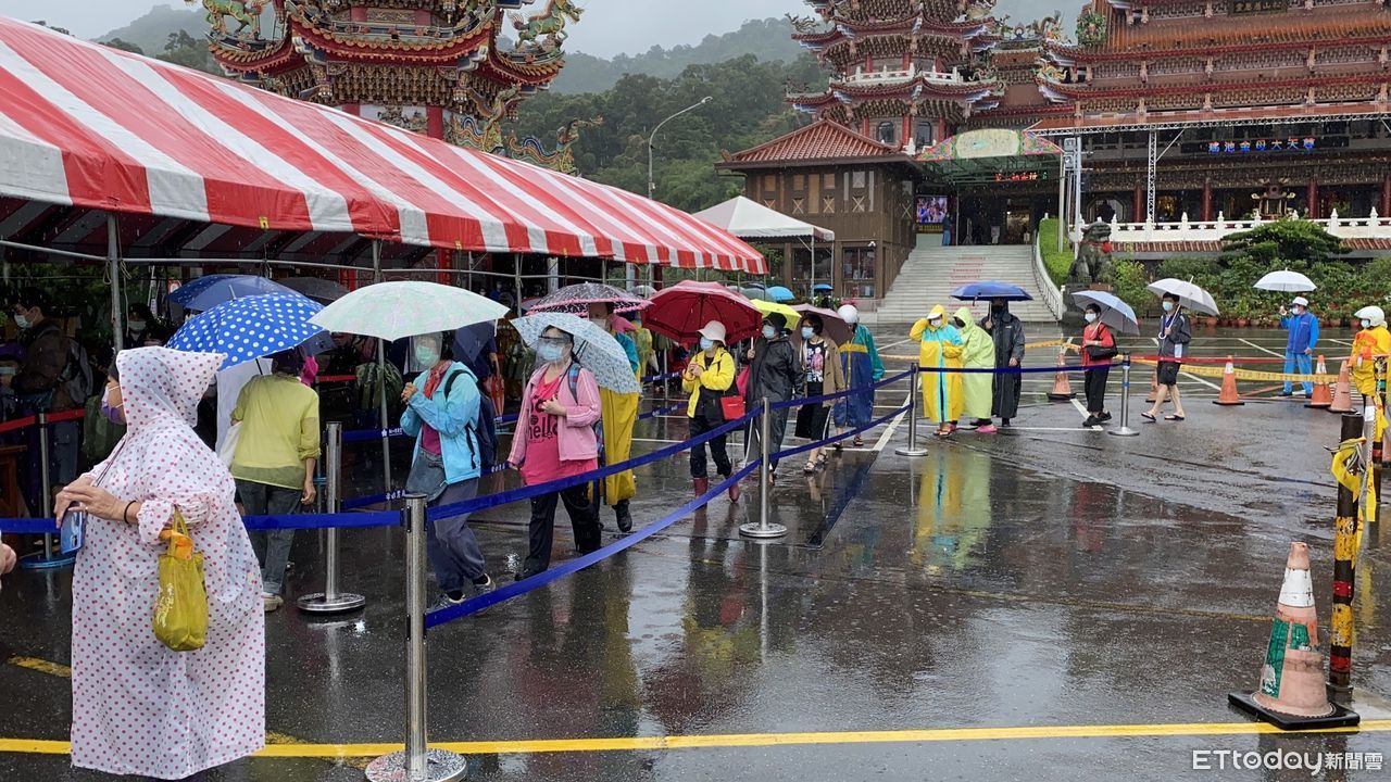 ▲民眾冒雨搶慈惠堂免費快篩試劑。(圖/記者游宗樺攝)