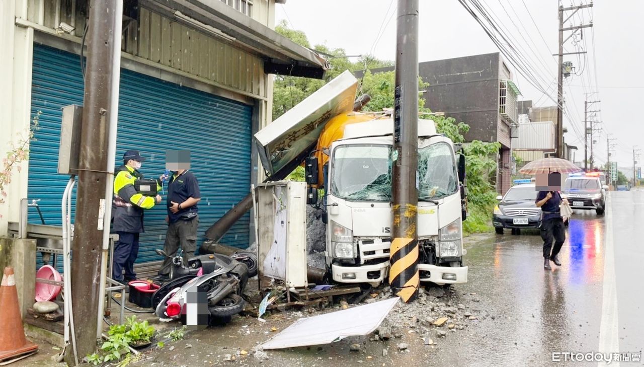 ▲桃園市林姓男子14日清晨駕駛大貨車行經楊梅區幼獅路,突然失控撞向路旁電線桿,造成電桿斷裂、機車被撞壞等慘狀。(圖/記者沈繼昌翻攝)