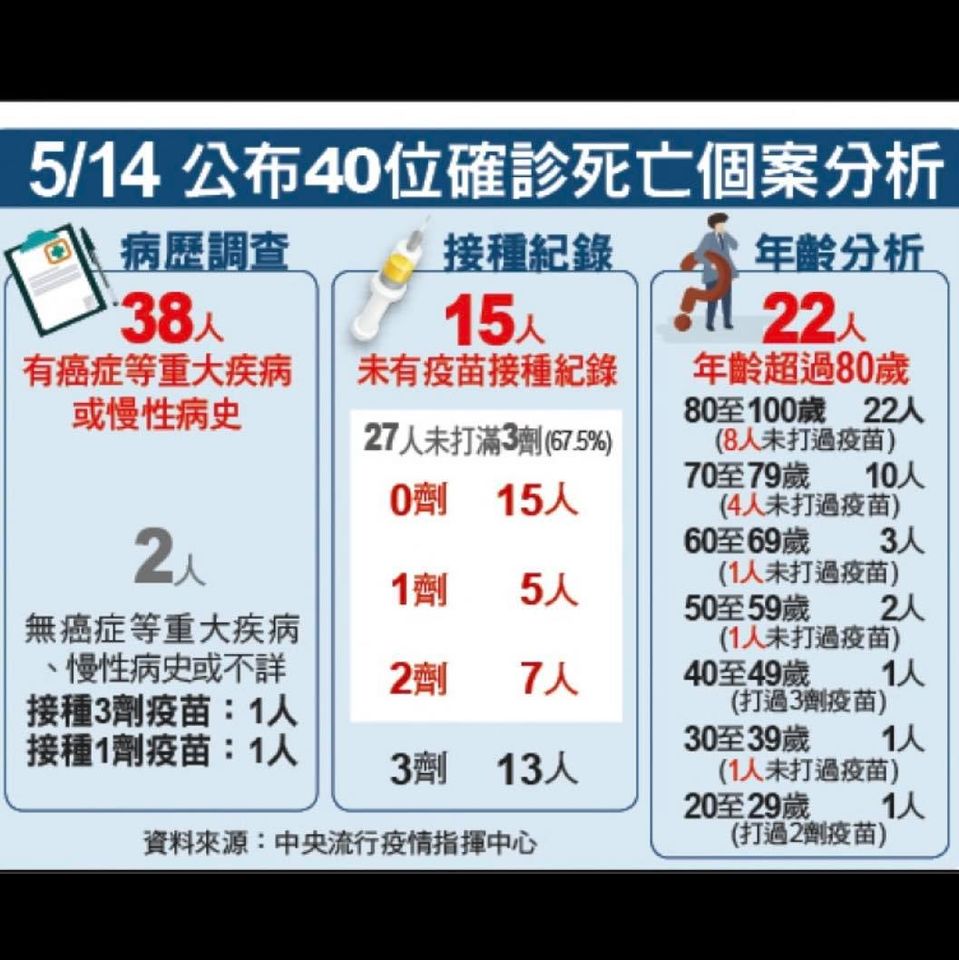王定宇指出,14日公布的不幸死亡案例,高風險群有三個特徵,包括:「沒有完整接種疫苗」、「年齡較高」、「重大疾病或長期慢性疾病」。他認為,可見「完整接種疫苗」有助降低中重症。
