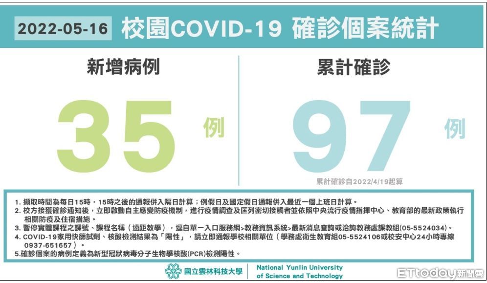 雲林科技大學公告今日新增確診學生35例,自4/19起累計已達97例,宣布自今天起課程若有師生確診、隔離或框列,授課方式請教師與學生溝通後採彈性處理。雲林科技大學指出,學校已自5月23日起全部課程遠距教學至6/26學期末結束,學校明天會召開防疫會議,相關細節另行公布。
