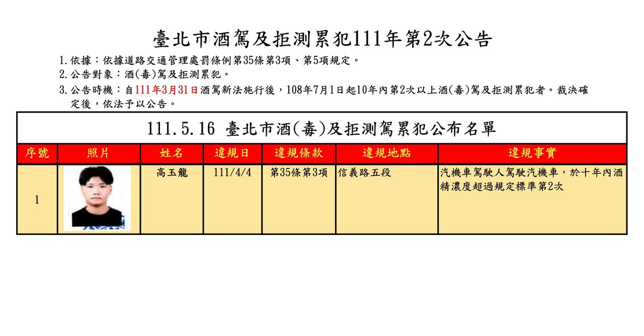 酒駕新法上路,針對屢次酒駕或拒測違規再犯者,除了加重罰鍰、、吊銷駕駛執照及道安講習等處分,並得公布酒駕累犯的姓名、照片及違規事實。台北市交通局裁決所日前公布1名酒駕累犯者姓名與照片後,16日再度公布酒駕累犯者「高玉龍」照片,曾經在今年2月酒駕,4月又再犯。