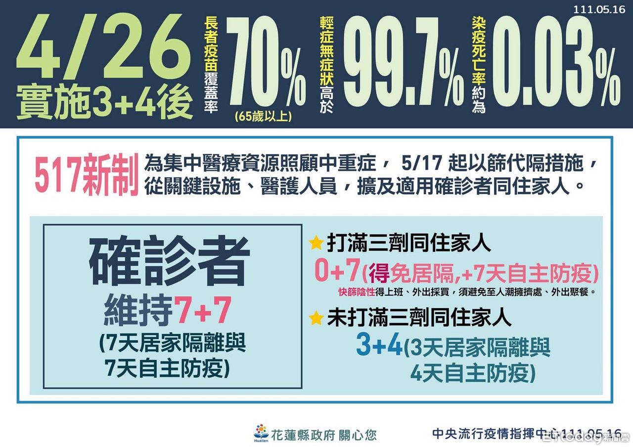 花蓮縣16日新增860例新冠肺炎確診個案,累積確診病例共計14419人,目前尚在隔離中1783人,花蓮縣衛生局長朱家祥在當天下午的防疫記者會上表示,17日起,針對確診個案同住家人之政策調整為「完成3劑疫苗接種者」,免除居家隔離,改為進行7天自主防疫。