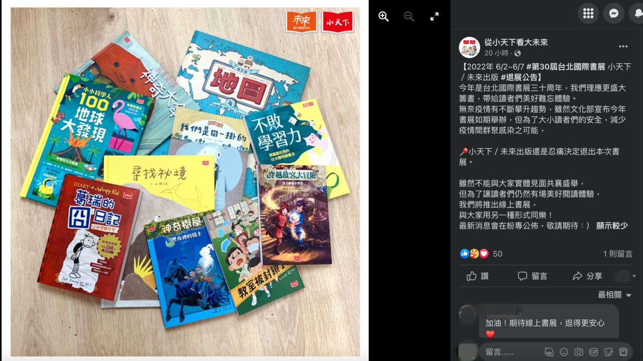 台北國際書展將於6/2-7如期舉行,由於本土疫情持續嚴峻,關於續辦也在近日引發各界討論。目前已有不少出版社率先在社群表態退出書展,包括天下雜誌、康健、親子天下、尖端、小光點、小兵、小魯等,這些出版社多以童書、親子類圖書為主軸,多半是考量兒童現在還沒有疫苗可施打,為了保護讀者健康及多方考量而「忍痛放棄」。
