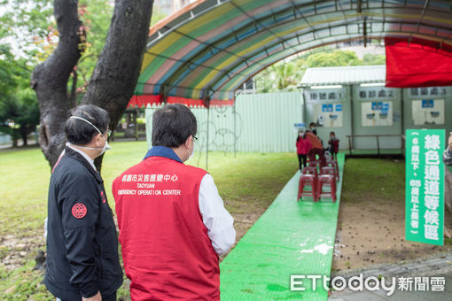 ▲桃園市長鄭文燦17日上午視察中壢區中正公園三合一綠色通道後表示,桃市9處社區採檢站,今日起全面設置「長者、幼兒PCR三合一綠色通道」。(圖/記者沈繼昌翻攝)