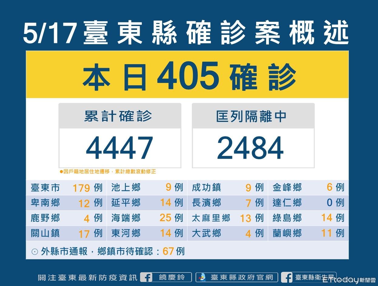 台東縣17日新增405名確診者,338人戶籍或居住地分在台東、67人為外縣市醫院通報。從疫調結果初步推論,年齡介於0-99歲。現累計4447確診;接觸者現管人數2484人。