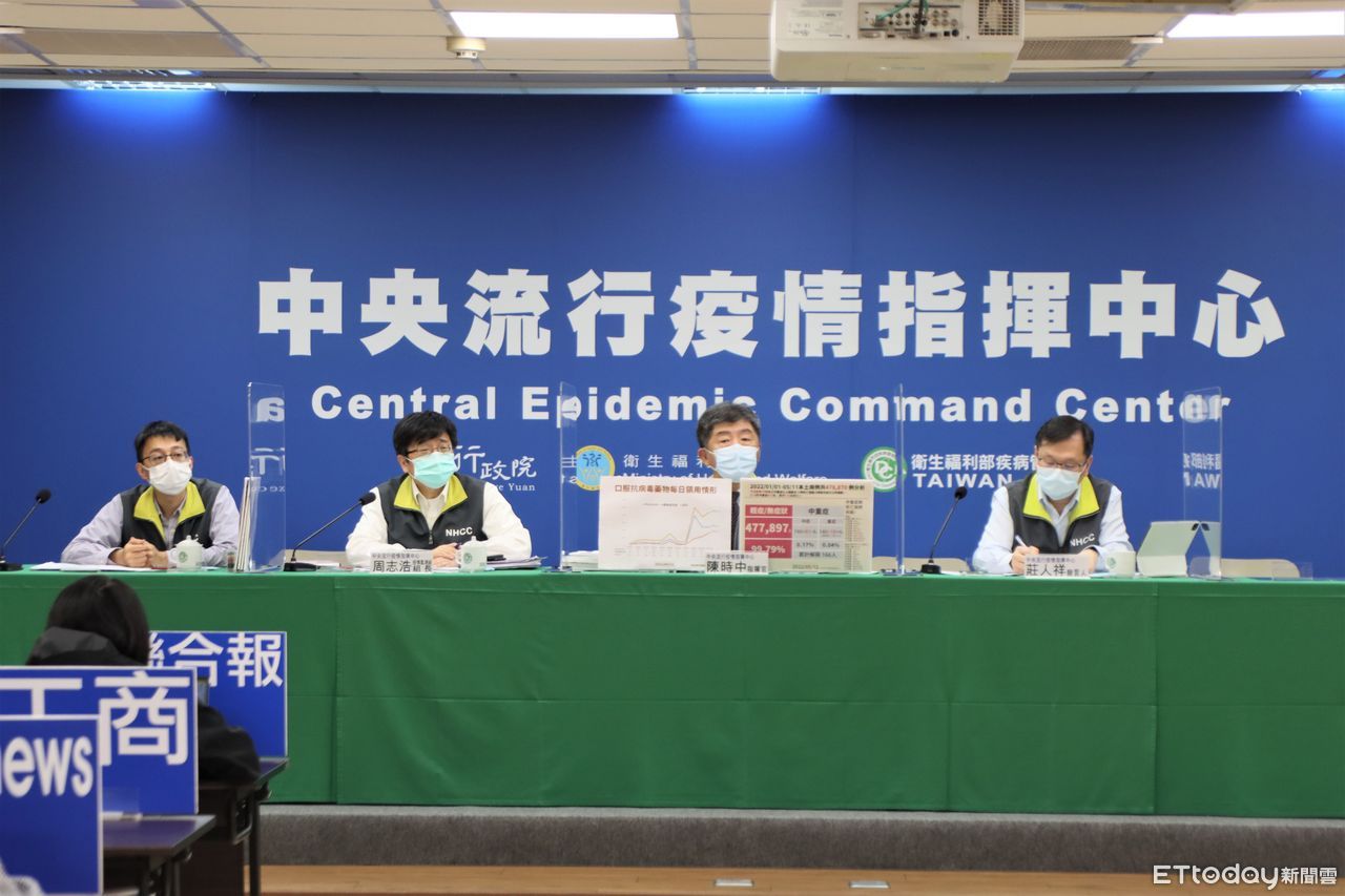 ▲指揮中心記者會,左起醫療應變組副組長羅一鈞、疫情監測組組長周志浩、指揮官陳時中、發言人莊人翔。(圖/指揮中心提供)