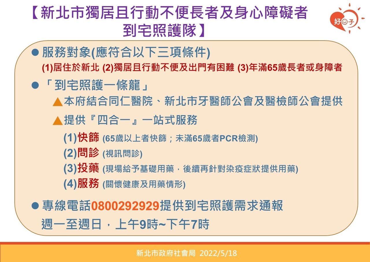 本土疫情加劇,新北市長侯友宜今(18)日在疫情記者會上宣布啟動到宅照護,對象為「居住於新北」、「獨居行動不便及出門有困難」、「年滿65歲長者或身障者」,並提供四合一(快篩、問診、投藥、服務)一站式服務。