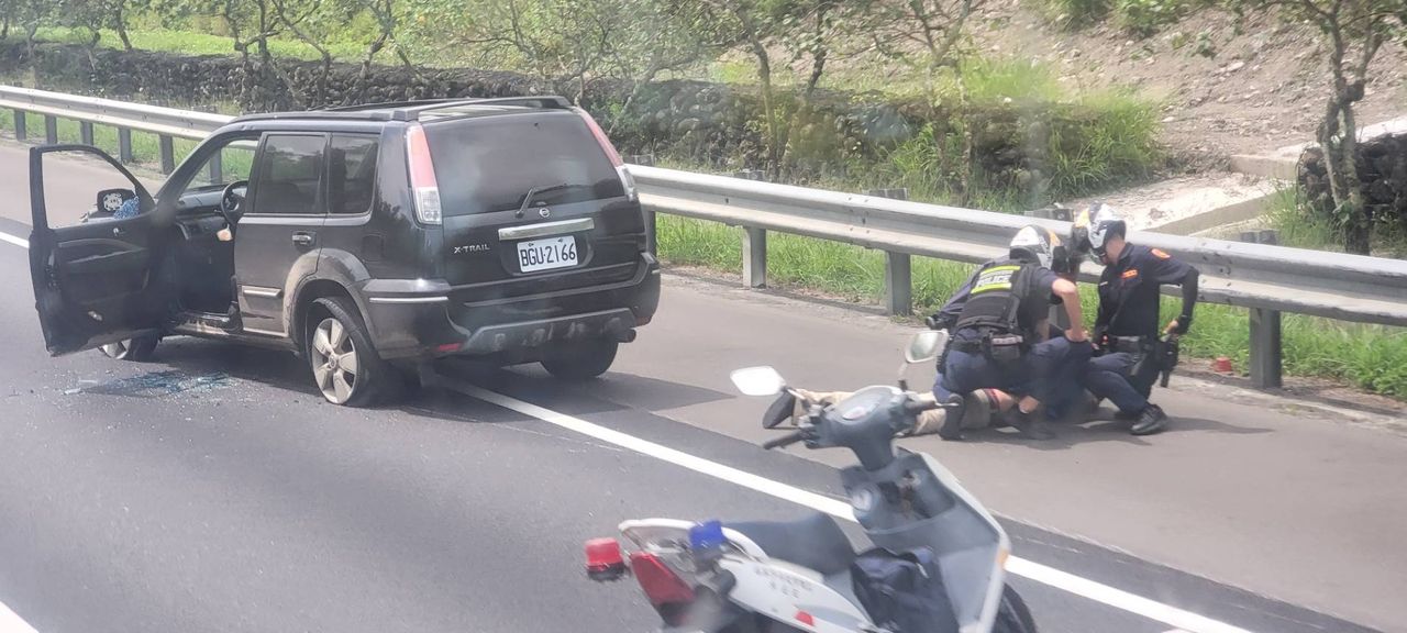 國道三號南下373公里處19日發生一起案件!一輛休旅車在路竹區發生車禍,但駕駛竟肇事逃逸,警方獲報後緊急跳上機車攔捕,沒想到竟一路追到國道上,最終將人攔下,目前警方正將駕駛載回派出所調查,全案仍需進一步調查釐清。