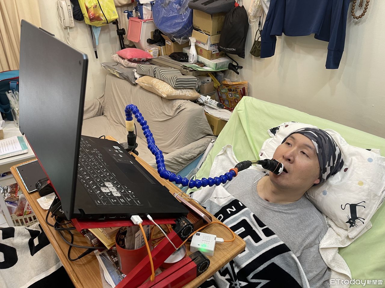 ▲脊髓損傷重癱的音樂人李振全,只能以頭部活動、使用嘴控滑鼠創作音樂。(圖/李振全提供,下同)