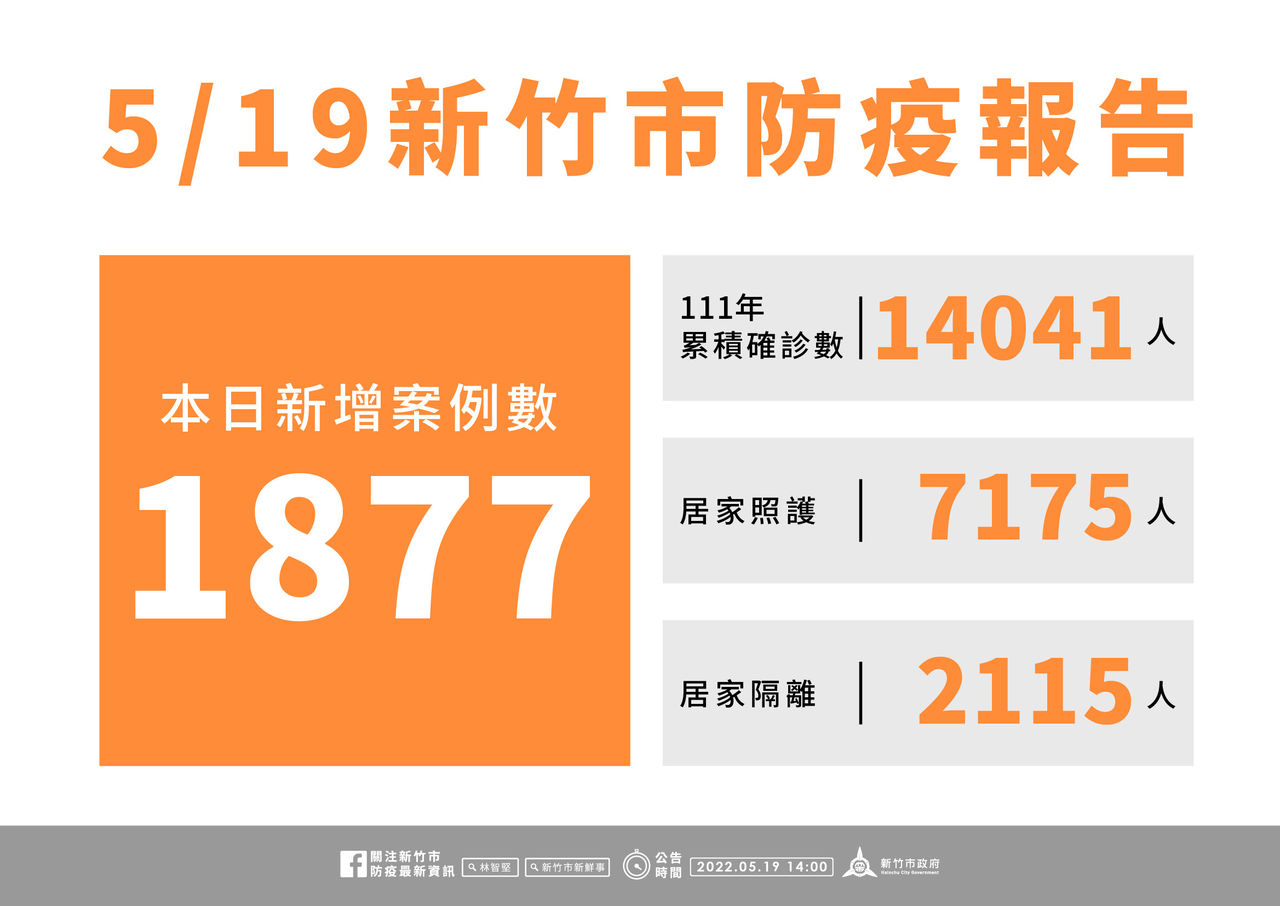 新竹市今(19)日新增1,877名確診個案,今(111)年以來累積14,041名確診個案,目前累積居家照護者為7,175人、居家隔離者為2,115人。