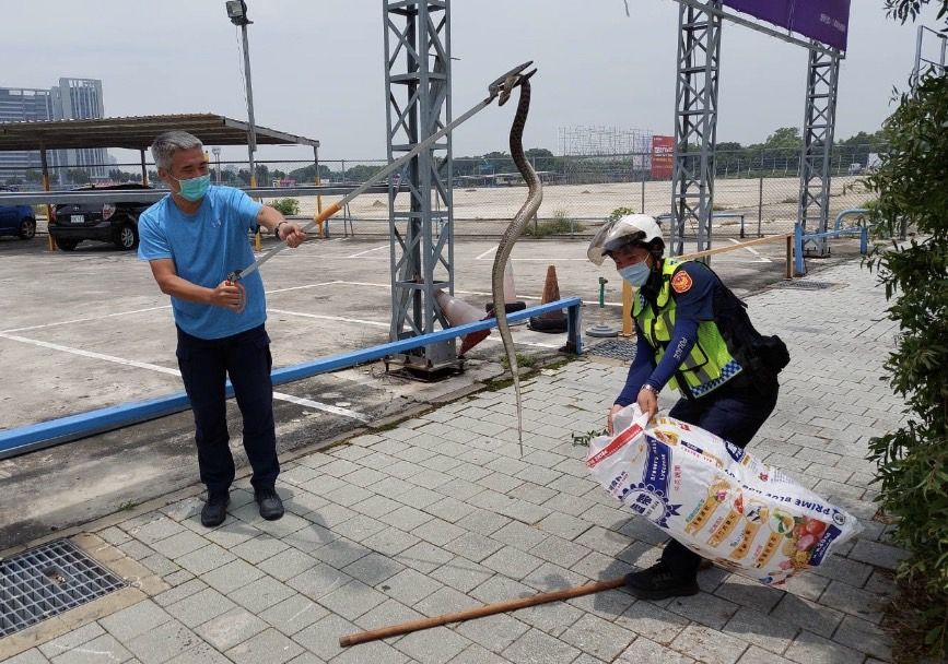 ▲高鐵台中站區發現一條臭青母,烏日警立即捕捉解危。(圖/警方提供,下同)