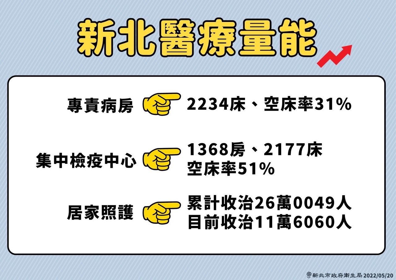 至於新北市醫療量能,侯友宜說明,目前專責病房有2234床、空床31%;集中檢疫中心1368房、2177床、空床率51%;居家照護累積收治26萬0049人、目前收治11萬6060人。