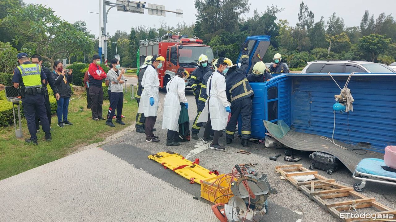 金門機場圓環21日上午發生一起嚴重車禍!現場一輛小貨車在行經圓環時,遭一輛廂型車攔腰撞上,猛烈撞擊力道,導致小貨車當場側翻路中,駕駛受困其中。警消獲報趕抵現場,緊急使用機具將駕駛救出送醫,至於詳細事故原因仍待調查釐清。