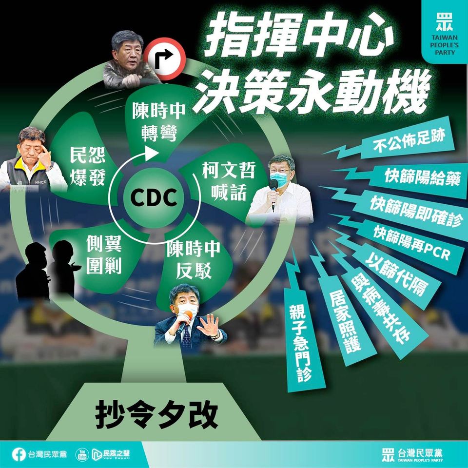民眾黨指出,「抄令夕改」堪稱民進黨政府防疫的永動機,抗疫2年多來,地方政府向陳時中提出許多諫言,卻因為政治立場不同,建議屢被視為挑釁,種種負面臆測與較勁,反而抹煞了朝野攜手防疫的機會。