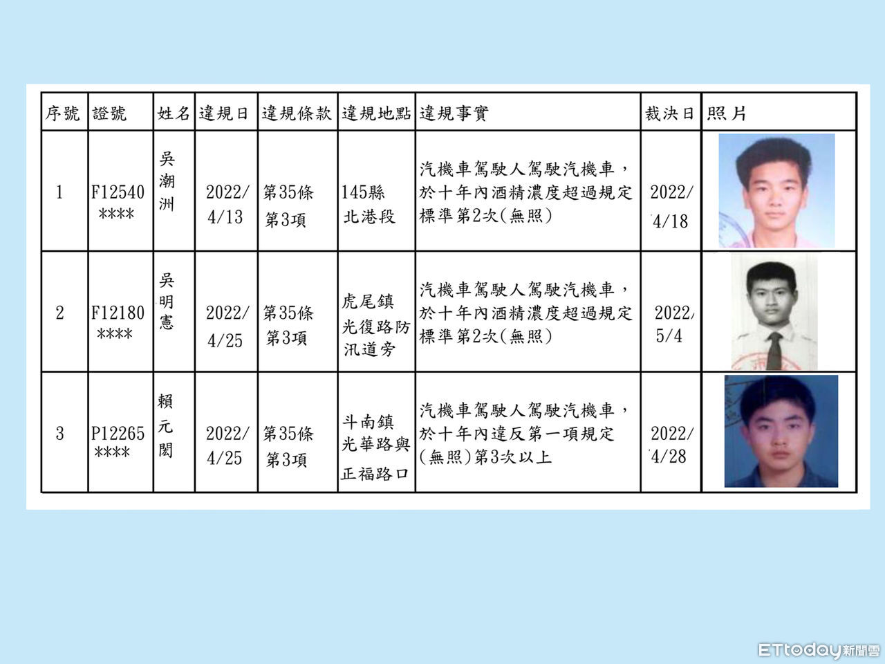 政府為遏阻酒駕,修正道路交通管理處罰條例加重處罰酒駕、拒測累犯,10年內酒駕累犯或酒駕拒測者,公路主管機關公布姓名、照片及違規事實,雲林監理站今(23)日公布首批雲縣酒駕累犯吳姓、賴姓男子,累計雲林縣公布3名酒駕累犯,都是男性駕駛。