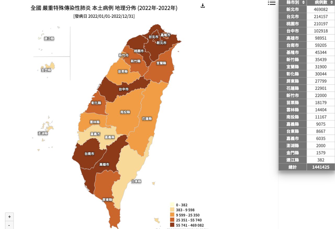 根據疾管署更新的「本土病例地理分布」可見,今年1月1日統計至今,全台累計144萬1425人染疫,其中台北市、新北市、桃園市、台中市均大於10萬例;連江縣則為唯一一個守在千例之內的縣市。