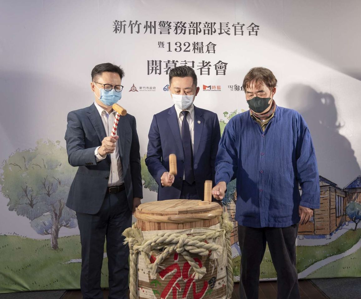 林智堅今日出席開幕記者會,將盛裝清酒的菰樽木蓋用槌子敲開,進行鏡開儀式,並與策展人潘國正老師、時藝多媒體傳播股份有限公司董事長黃文德等人一同開箱「新竹州警務部部長官舍」,欣賞展覽《飛行新竹市─潘國正空中散步攝影展》,132糧倉店經理劉得毅也介紹店內特色餐點。