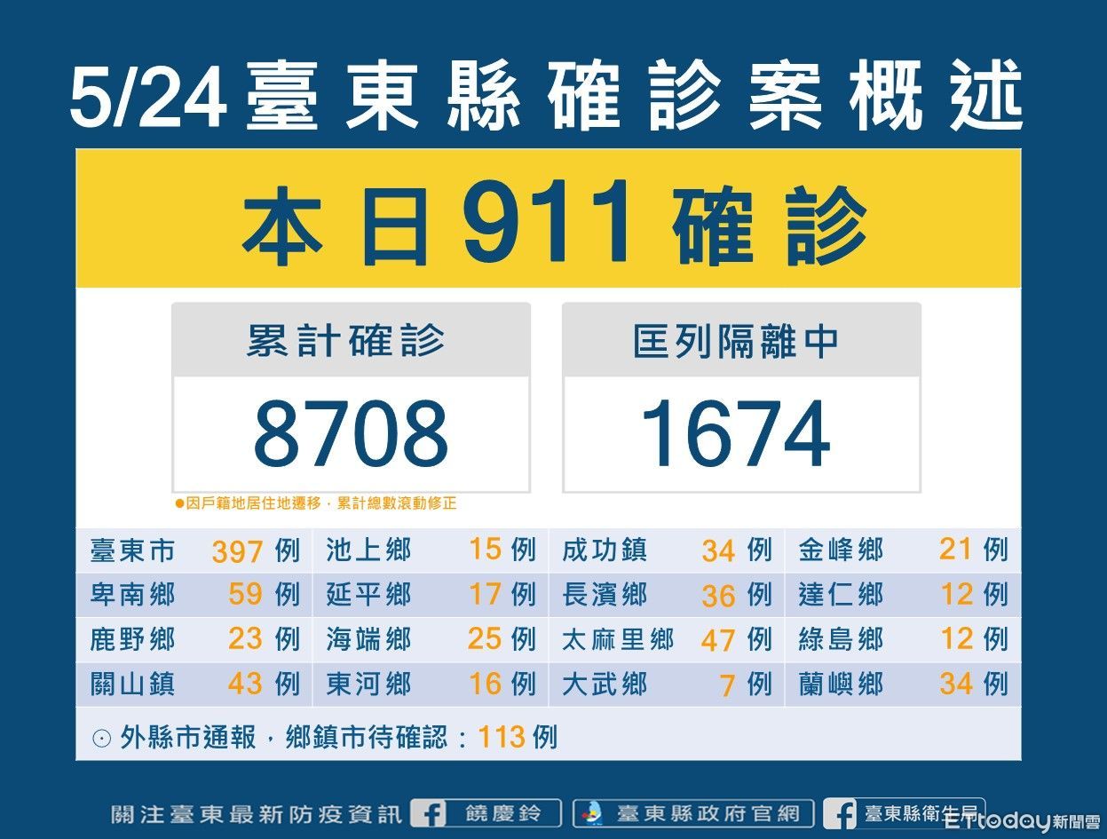 台東縣24日新增 911名確診者,798名民眾戶籍或居住地分在台東、113名為外縣市醫院通報。因應中央宣布昨(23)日起居住台東民眾快篩陽性,經醫師判定即可算確診,今日新增的確診個案中有376名個案(41%)經由快篩陽性醫師判定確診。目前台東縣累計確診個案8708名,居隔接觸者1674名。