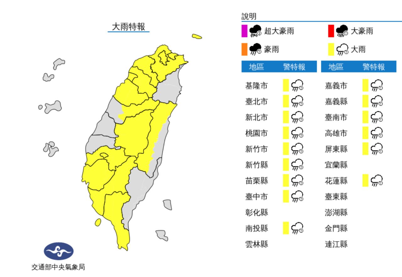 大雨特報範圍包括基隆北海岸、臺北市、新北市、桃園市、新竹市、新竹縣、苗栗縣、臺中市山區、南投縣、嘉義市、嘉義縣、臺南市、高雄市、屏東縣、恆春半島、花蓮縣山區。