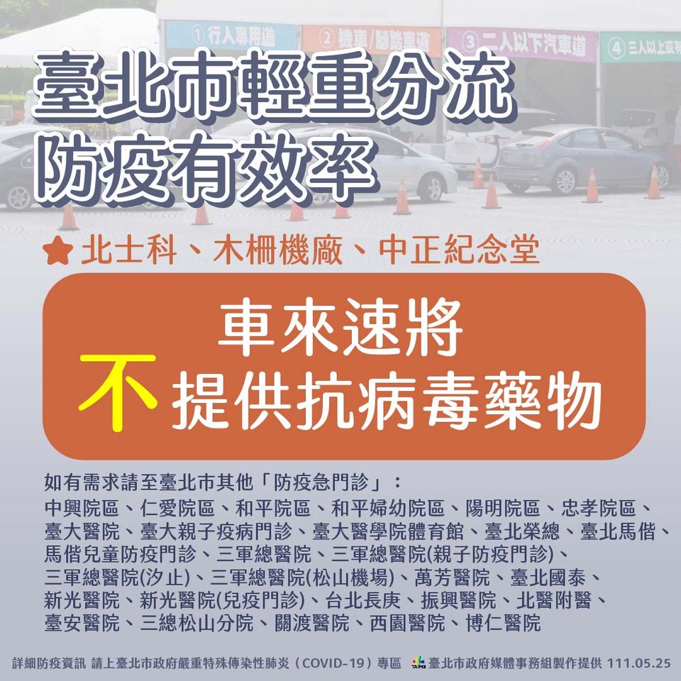 指揮中心宣布26日起全民適用「快篩陽性即確診」,持快篩陽證明就可先診斷、確診並領藥。台北市長柯文哲表示,台北市防疫急門診要轉型,車來速不提供抗病毒藥物,提供給65歲以下身體較健康、無須吃抗病毒藥物的感染者;而65歲以上或65歲以下但免疫力較低、需要吃抗病毒藥物者,則再到醫院防疫急門診。
