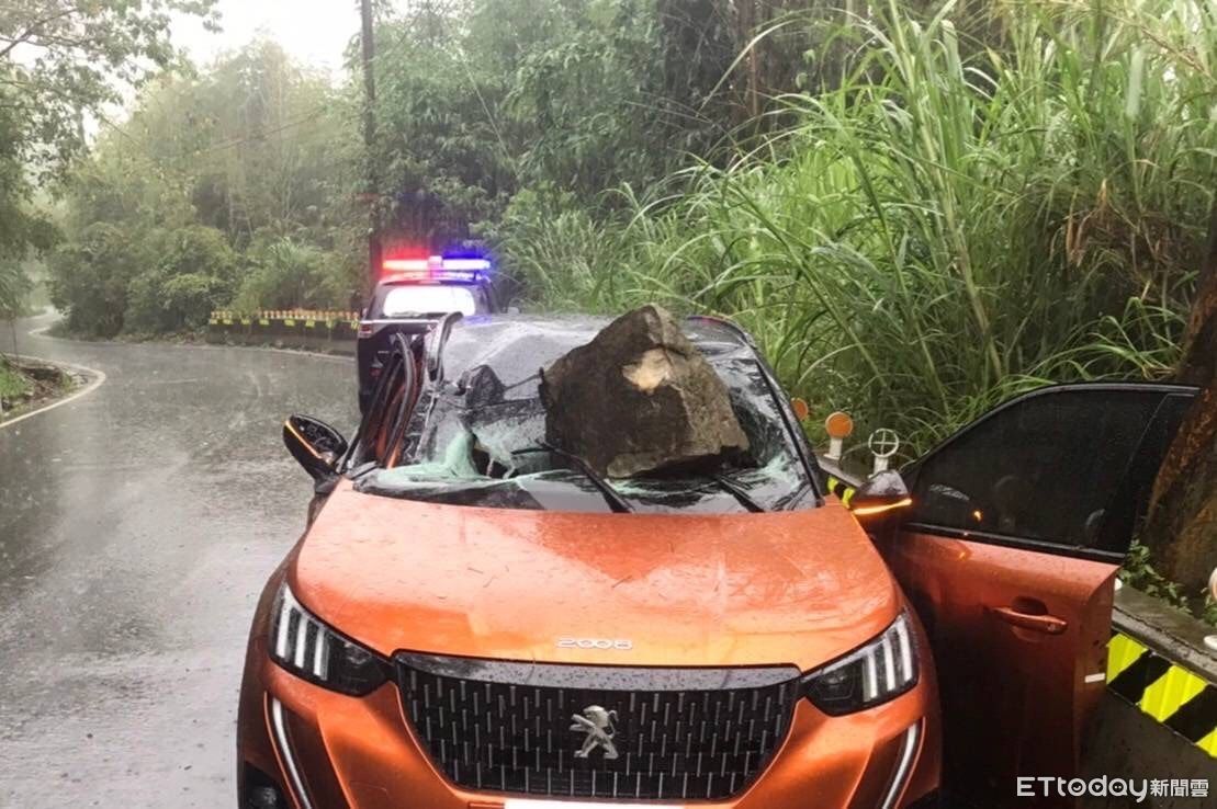 嘉義縣阿里山鄉達邦公路25日下午1時許一顆方形大石意外砸中路過進口休旅車,休旅車不僅整個前方擋風玻璃整個破裂凹陷,駕駛座車門反折、右後車門也明顯凹陷,毀損相當嚴重。