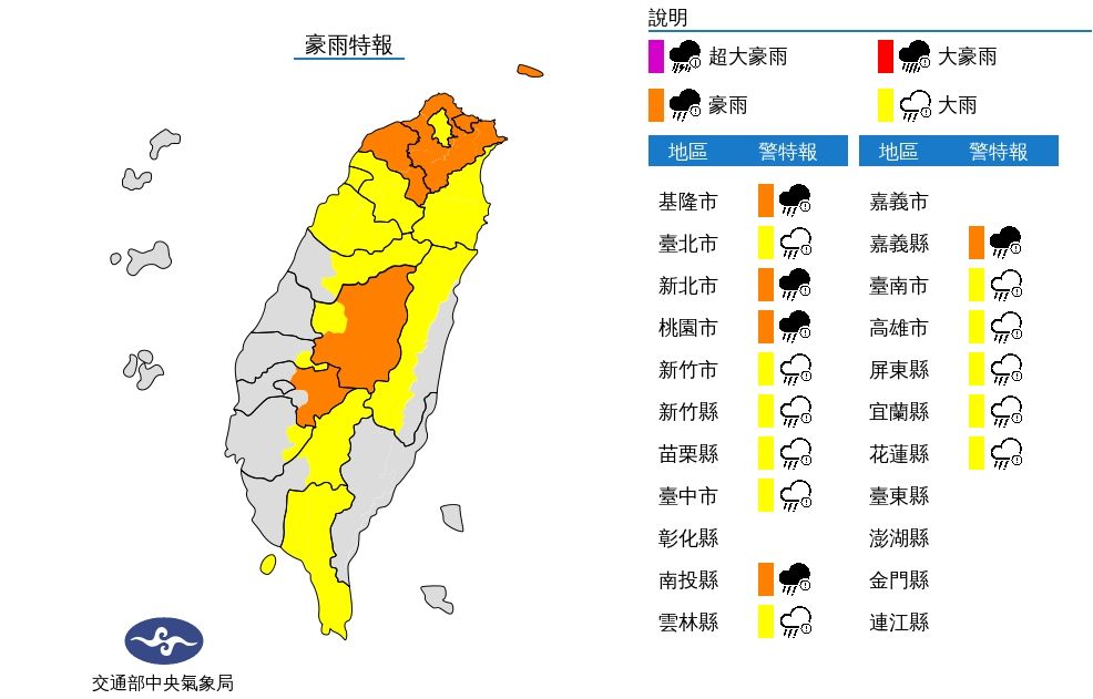 大雨特報範圍包括臺北市、新竹市、新竹縣、苗栗縣、臺中市山區、南投縣、雲林縣山區、臺南市山區、高雄市山區、屏東縣、恆春半島、宜蘭縣、花蓮縣山區。