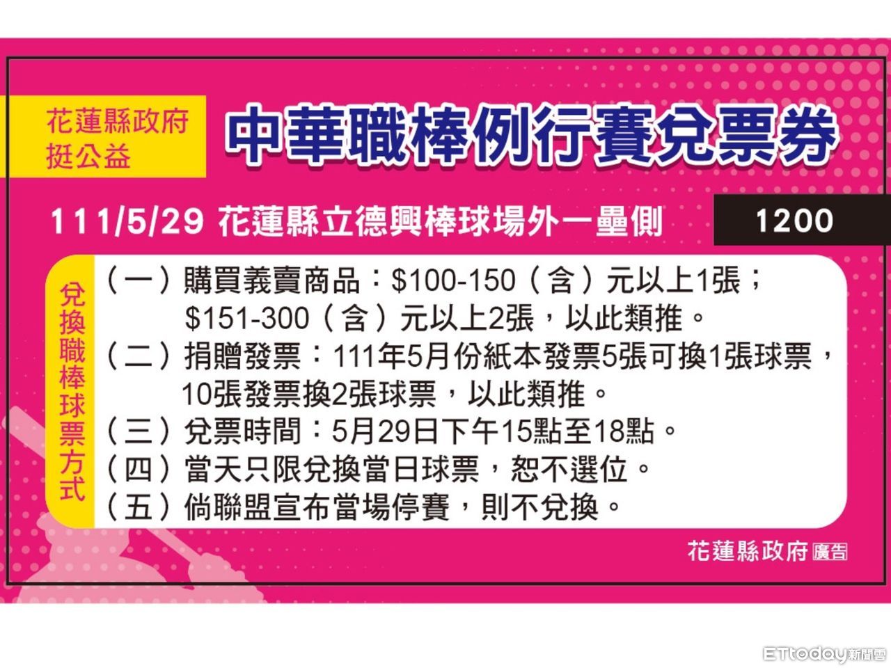 花蓮縣政府致力推動社會公益,除捐血贈職棒球票活動,也與花蓮縣善牧中心、花蓮縣幸福協會、花蓮縣肢體傷殘福利協進會、花蓮縣視覺障礙福利協進會、花蓮縣私立凱歌園少年中途之家合作,凡在5月26-29日到上述單位義賣地點購買義賣商品100-150元以上贈 球票兌換券一張,151至300元以上贈2張,以此類推;或捐贈今年5月份發票5張可換1張 球票兌換券 ,10張發票換2張 兌換券,以此類推,兌換時間於5月27日16時至19時、5月28、29日15時至18時,兌換地點在德興棒球場外一壘側區域。