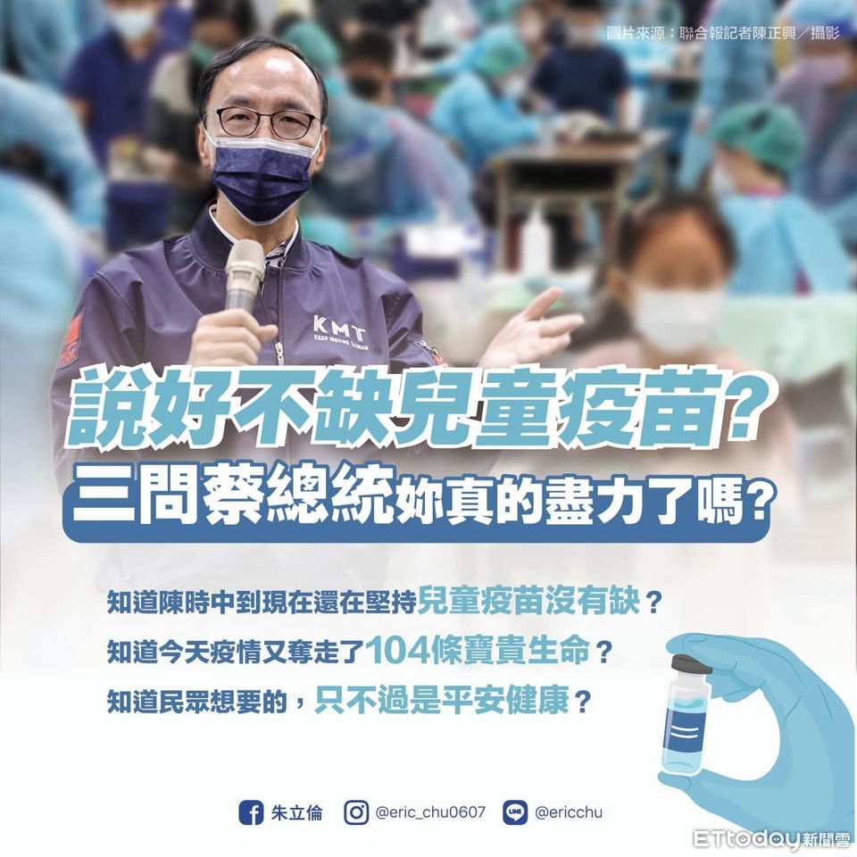 ▲朱立倫在臉書上3問蔡英文「說好不缺兒童疫苗?蔡總統你真的盡力了嗎?」。(圖/翻攝朱立倫臉書)