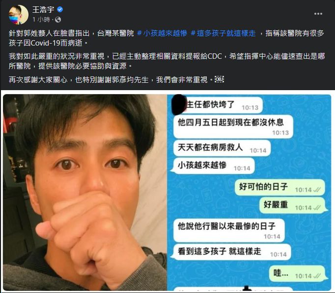 藝人郭彥均25日凌晨在臉書分享與醫護朋友的對話,對方哭訴,院內的同仁長期沒休息,許多孩子病況越來越慘,「看到這(麼)多孩子,就這樣走」等。對此,民進黨桃園市前議員王浩宇表示,「我對如此嚴重的狀況非常重視,已經主動整理相關資料提報給CDC,希望指揮中心能儘速查出是哪所醫院」。