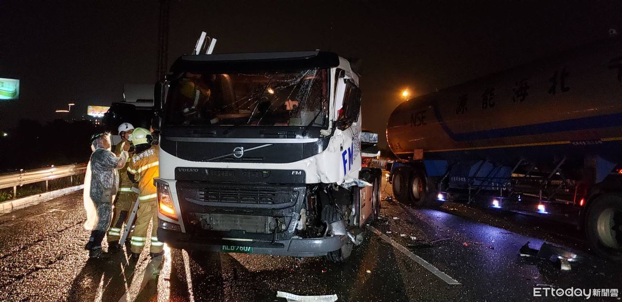 晚間7時6分許,消防人員到場發現,現場一輛丁二烯槽車車頭受損,槽體無影響、無洩漏,還有一輛聯結車、2部自小客車車禍,總計傷者3名,無人受困。