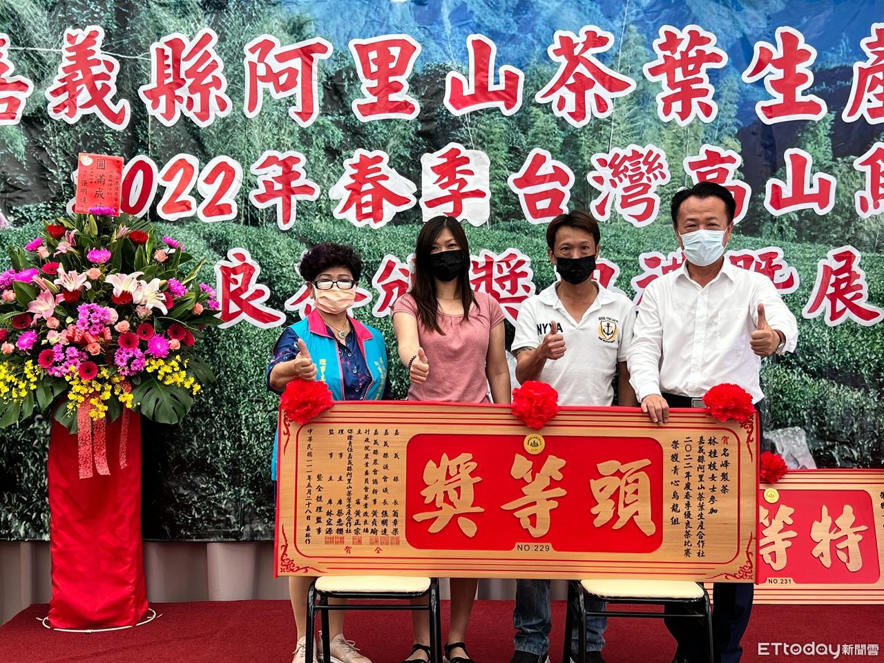 阿里山茶葉生產合作社2022年春季優良茶比賽因疫情移至茶改場魚池分場舉行評鑑,烏龍組和新品種組分別由名峰製茶廠蘇于廓和盧麗兒奪下特等獎,明峰製茶廠蘇志峰及太太林瑞芬更一舉拿下青心烏龍雙頭等獎,相關得獎者28日上午在仁義湖岸大酒店由縣長翁章梁親自頒獎表揚。