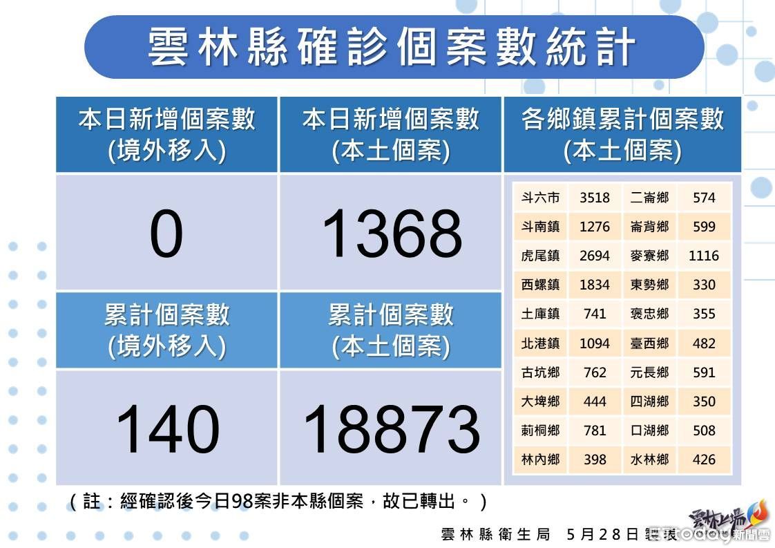 雲林今(28)日新增1368例本土確診個案,分別為斗六310例,斗南173例,虎尾171例,西螺98例,土庫79例,北港77例,莿桐54例,古坑52例,麥寮50例,元長46例,林內43例,台西35例,二崙31例,口湖30例,水林25例,崙背24例,四湖15例,褒忠、東勢各13例,大埤29例個案分佈20鄉鎮。