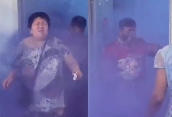 由於當時房內人特別多,當地也流行鬧新人,其中一名伴郎就把2顆小型煙霧彈丟進擠滿人的新娘房,由於煙霧濃厚味道重,所有人立刻都被燻了出來,這一炸,不僅炸出大媽,還把新郎炸灰頭土臉地出來,唯獨新娘仍然待在房內,因為沒穿高跟鞋。
