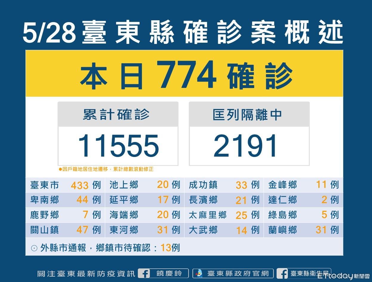 台東縣28日新增 774名確診者,761名民眾戶籍或居住地分在台東、13名為外縣市醫院通報。目前台東縣累計確診個案 11555人、居隔者2191人。1名男性確診病患死亡。