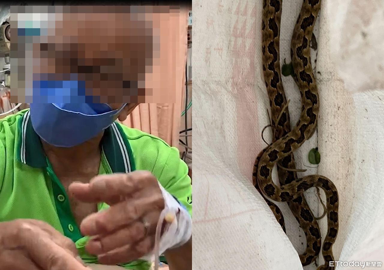 ▲老翁整理菜園遭龜殼花咬傷,乾脆徒手抓「當事蛇」找醫師。(圖/記者游宗樺翻攝)
