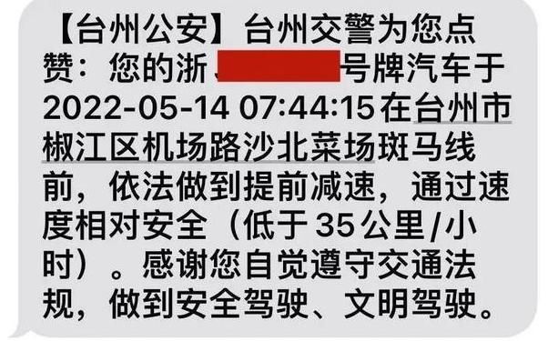 浙江省公安廳指出,這是台州交警自主研發的斑馬線機動車減速提示系統發出的簡訊。系統會根據重點路口通過車輛的速度,進行分析後,分別發送不同內容的提示簡訊,其中,對車速超過50公里/時的車輛,進行安全警示;對超過35公里/時的車輛,進行安全提醒;對低於35公里/時的車輛,點讚表揚,這一做法為也成為大陸首創。