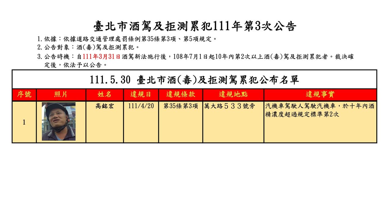 台北市交通事件裁決所30日表示,依據酒駕新法規定,針對屢次酒駕或拒測違規再犯者,於交通局官網公告今年第3次酒駕累犯者姓名、照片及違規事實。