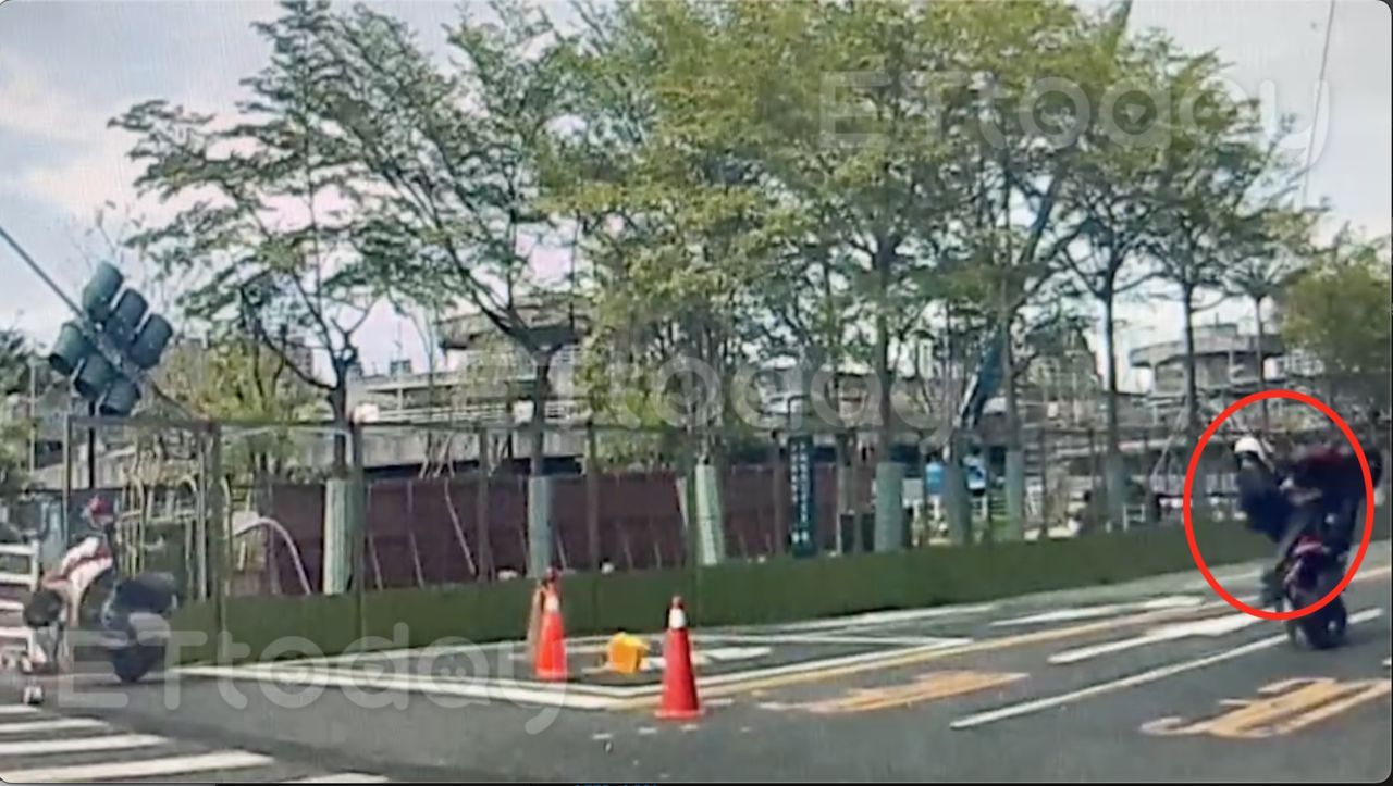 ▲紅綠燈被扯斷,電線險成血滴子,一名女騎士被勾到脖子摔傷畫面曝光 。(獨家授權圖/記者吳奕靖翻攝)