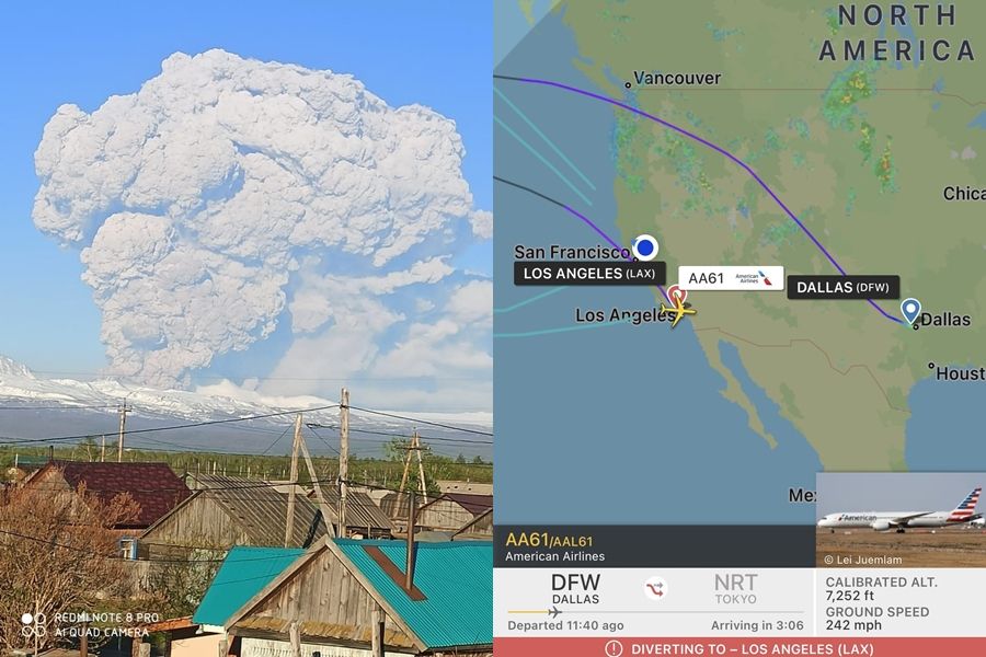 俄羅斯東海岸一座火山28日噴發,煙柱竄至15公里高空。一架從美國德州達拉斯起飛的美國航空(American Airlines)班機當時正飛往日本東京,卻在飛越北太平洋時因火山噴發,不得不緊急掉頭,飛行12小時後降落在加州洛杉磯。