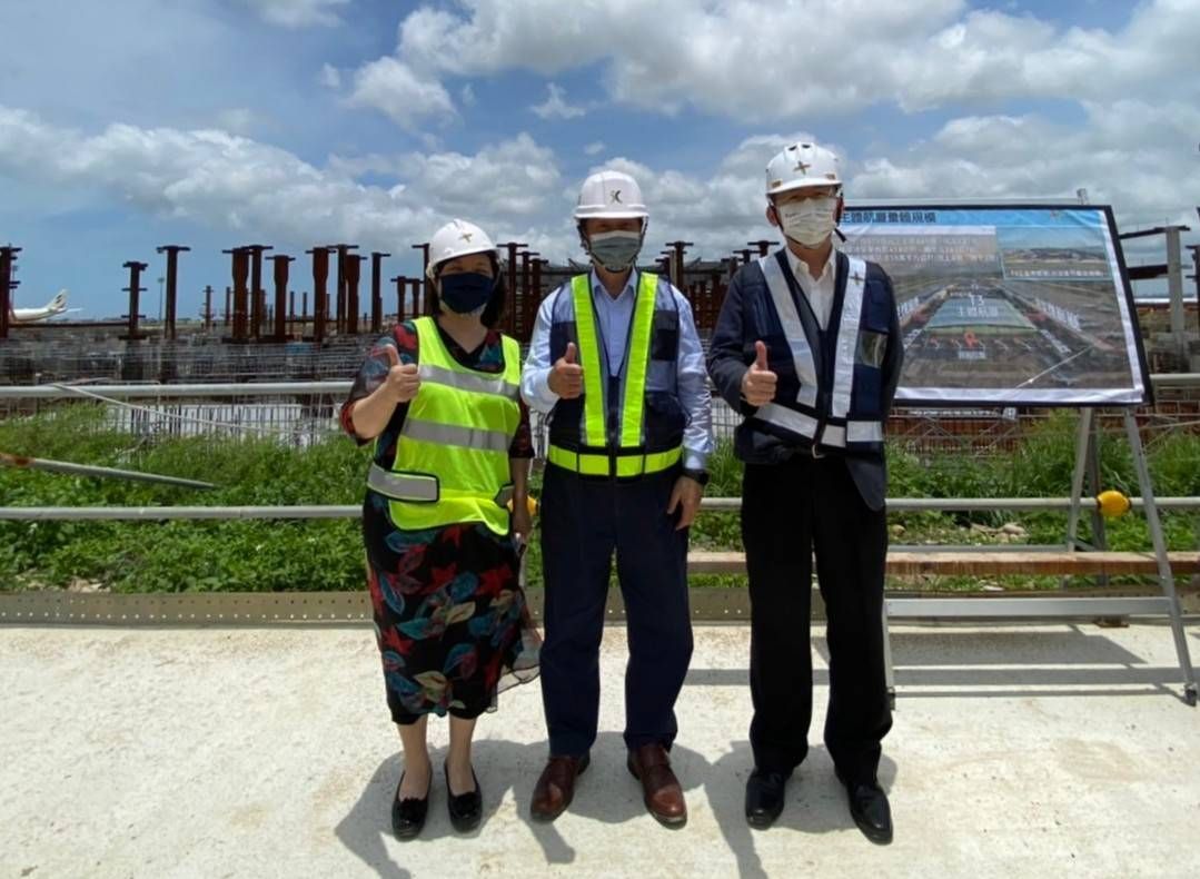 ▲行政院政務委員吳澤成(中)與行政院交通環境資源處處長陳盈蓉(左)在機場公司董事長林國顯的陪同下視察第三航站區建設工程。(圖/桃園機場公司)
