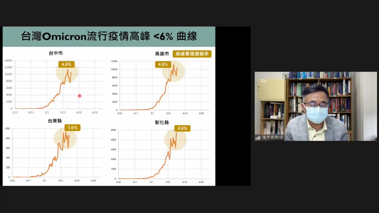 陳秀熙表示,不同縣市高峰點所得到的累積通報感染數不同,高峰累積通報率達7~10%時,流行疫情就會開始下降。基隆市10.1%,台北市8.5%,新北市8.2%,桃園市6.8%,新竹縣7.45%,新竹市7.8%,宜蘭縣8.2%,花蓮縣9.0%,這8個縣市目前皆已達高峰點,正處於往下降的趨勢。