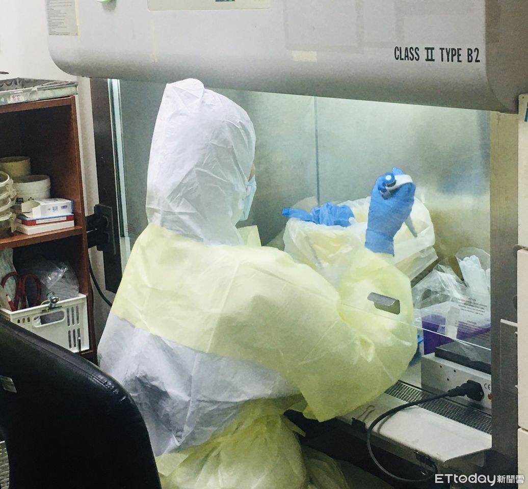 ▲醫檢師著防護裝備處理檢體。(圖/記者楊漢聲翻攝)