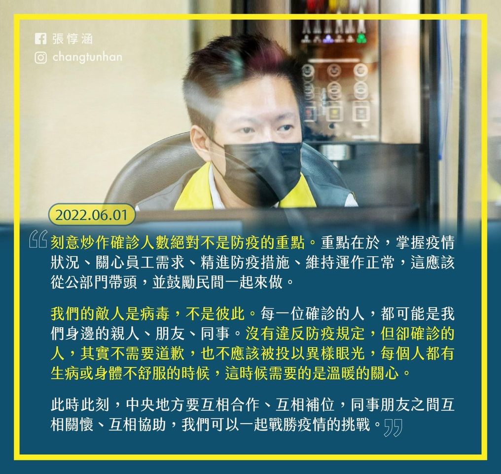 張惇涵指出,刻意炒作確診人數絕對不是防疫的重點。重點在於,掌握疫情狀況、關心員工需求、精進防疫措施、維持運作正常,我認為,這應該從公部門帶頭,並鼓勵民間一起來做。