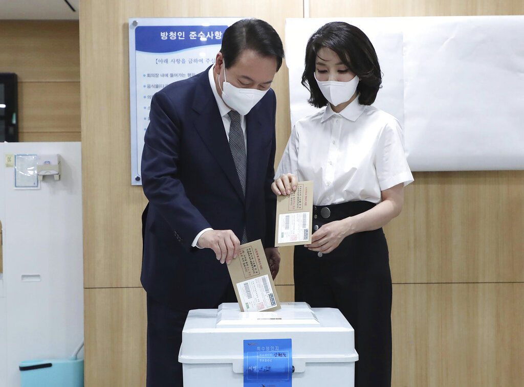 ▲ 南韓總統尹錫悅、金建希夫婦5月27日進行事前投票。(圖/達志影像/美聯社)