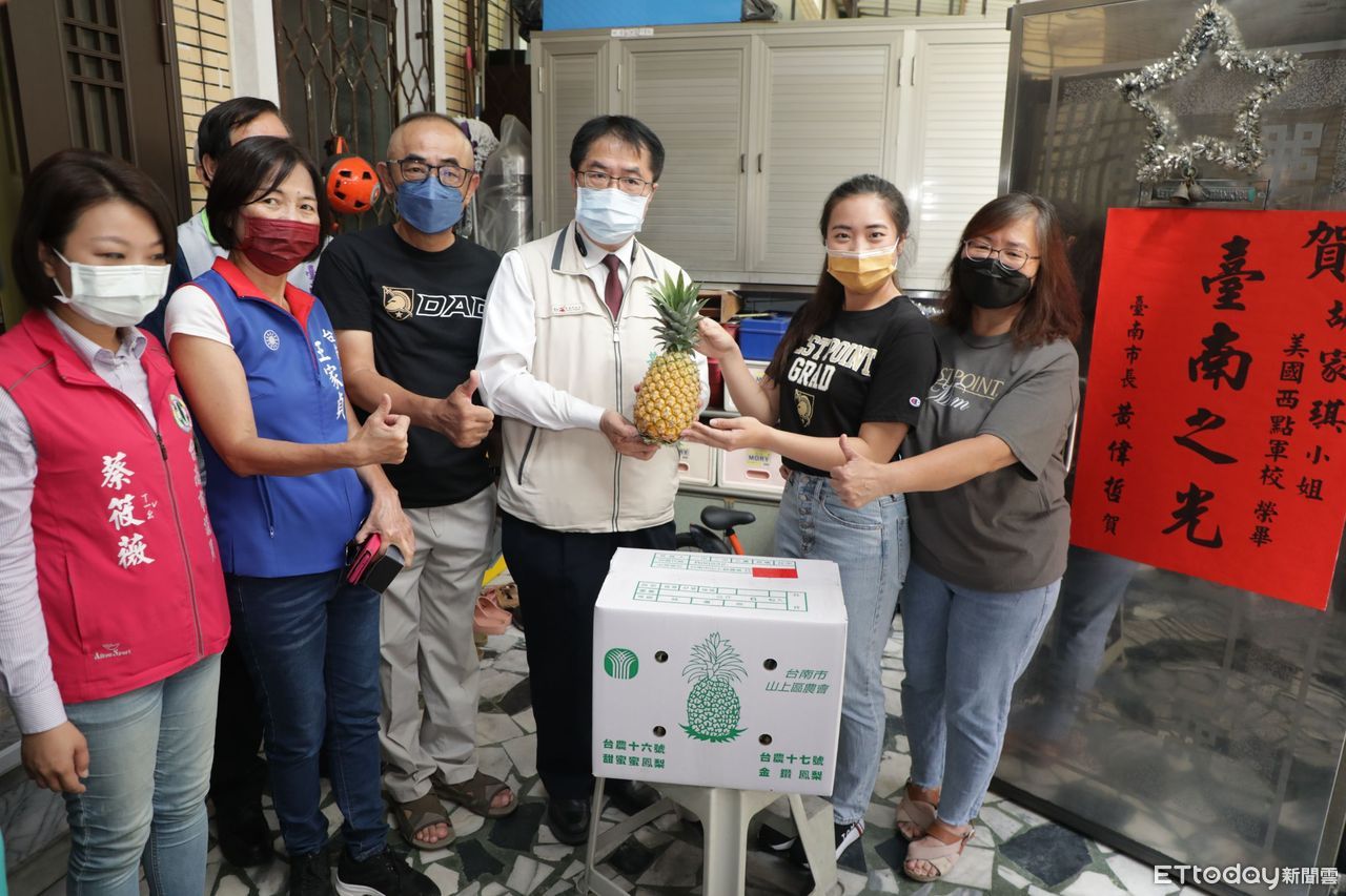 ▲台南女兒胡家琪西點軍校畢業載譽歸國,市長黃偉哲親贈鳳梨及紅榜祝賀為台南爭光。(圖/記者林悅翻攝,下同)