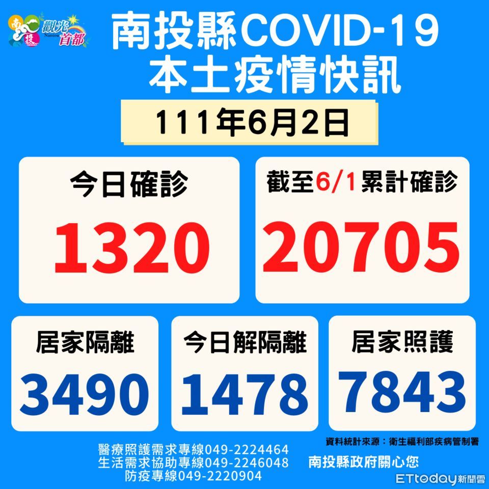 中央流行疫情指揮中心今天公布南投縣確診人數1320例,截至6月1日累計確診人數2萬705例,居家隔離人數3490例,今日已解除隔離1478例,居家照護人數7843例,各鄉鎮確診人數即時訊息詳見https://reurl.cc/2ZWkKO。