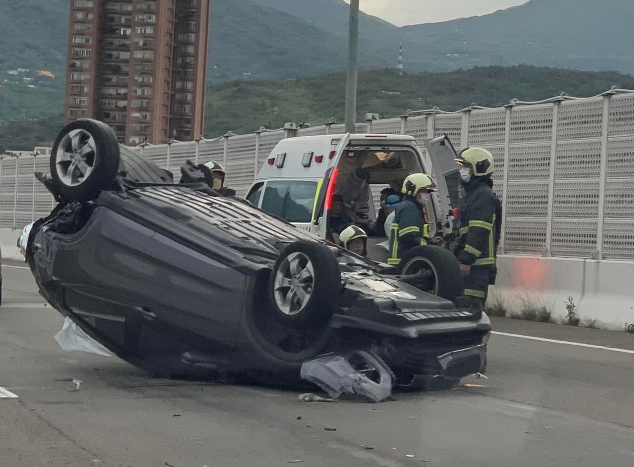 ▲洲美快速道路轎車翻覆。(圖/翻攝臉書/細說淡水)